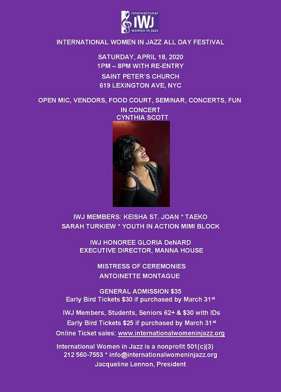 Saturday – April 18, 2020 – 1:00p.m. – Saint Peter’s Church – NYC – INTERNATIONAL WOMEN IN JAZZ ALL DAY FESTIVAL – 619 Lexington Ave. & East 54th St., NYC