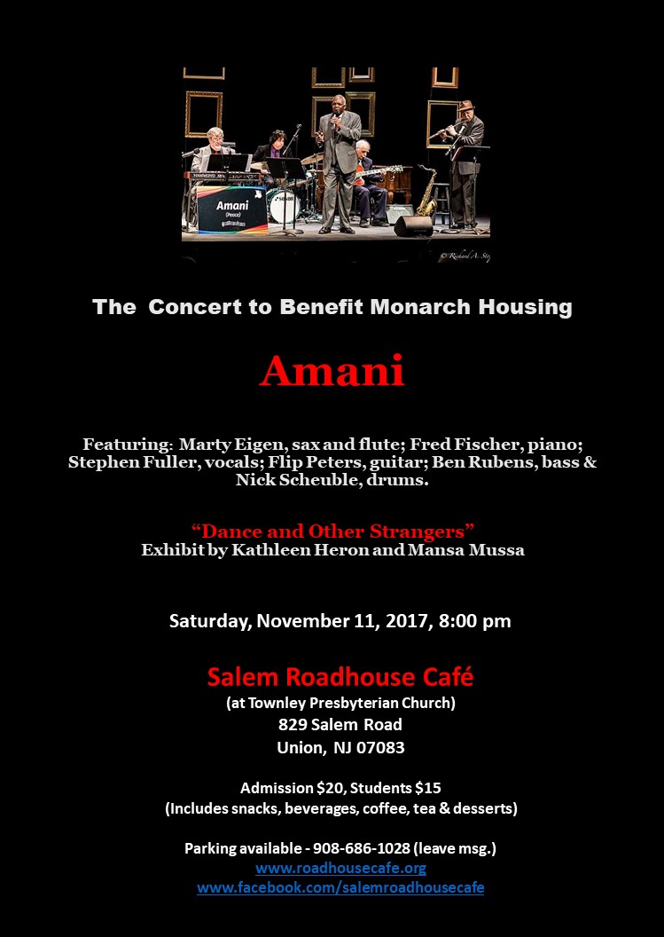 Saturday – November 11, 2017 – 8:00p. – Union NJ – AMANI BENEFIT CONCERT FOR MONARCH HOUSING – 829 Salem Road (at Townley Presbyterian Church) – Tel. No. 908.686.1028 (leave message please) – www.roadhousecafe.org .