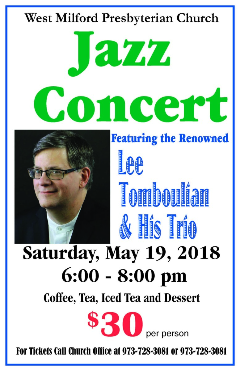 Saturday – May 19, 2018 – 6:00p.m. – West Milford Presbyterian Church – N.J. – LEE TOMBOULIAN TRIO CONCERT – 1452 Union Valley Road, West Milford, NJ 07480 – TEL. NO. 973.728.3081.
