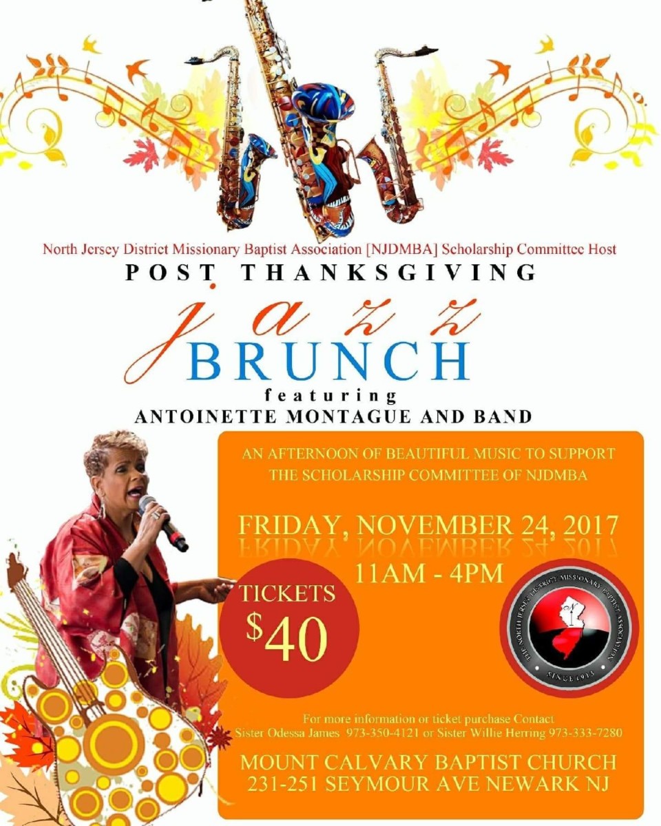 Friday – November 24, 2017 – 11:00a. – 4:00p. – Mount Calvary Baptist Church – Newark NJ – POST THANKSGIVING JAZZ BRUNCH FEATURING ANTOINETTE MONTAGUE & BAND – 231 – 251 Seymour Ave.
