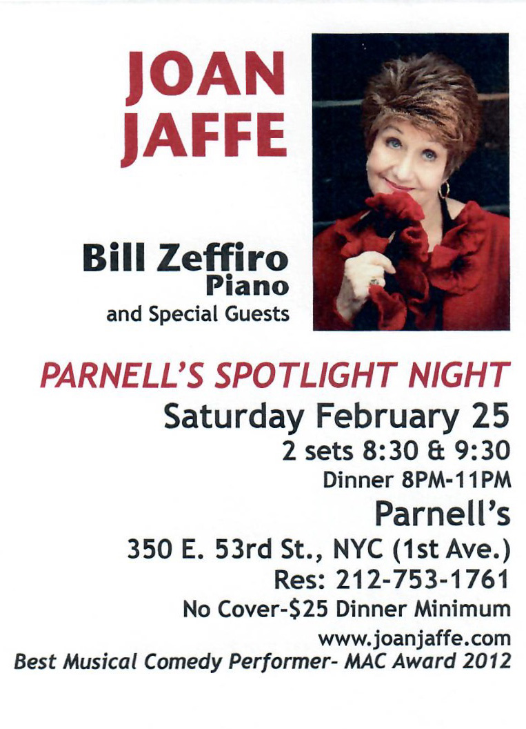 Saturday – February 25, 2017 – 8:00p. – 11:00p. – Parnell’s Restaurant – NYC – JOAN JAFFE with Bill Zeffiro -350 East 53rd St.& 1st Ave. – Reservation Tel. # 212.753.1761.