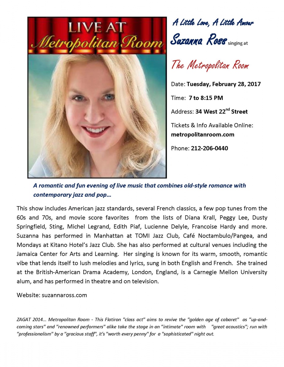 Tuesday – February 28, 2017 – 7:00p. – 8:15p. – Metropolitan Room – NYC – SUZANNA ROSS (A Little Love, A Little Amour) – 34 West 22nd St. (between 5th & 6th Aves.) – Reservations / Tickets via www.metropolitanroom.com or Tel. No. 212.206.0440.