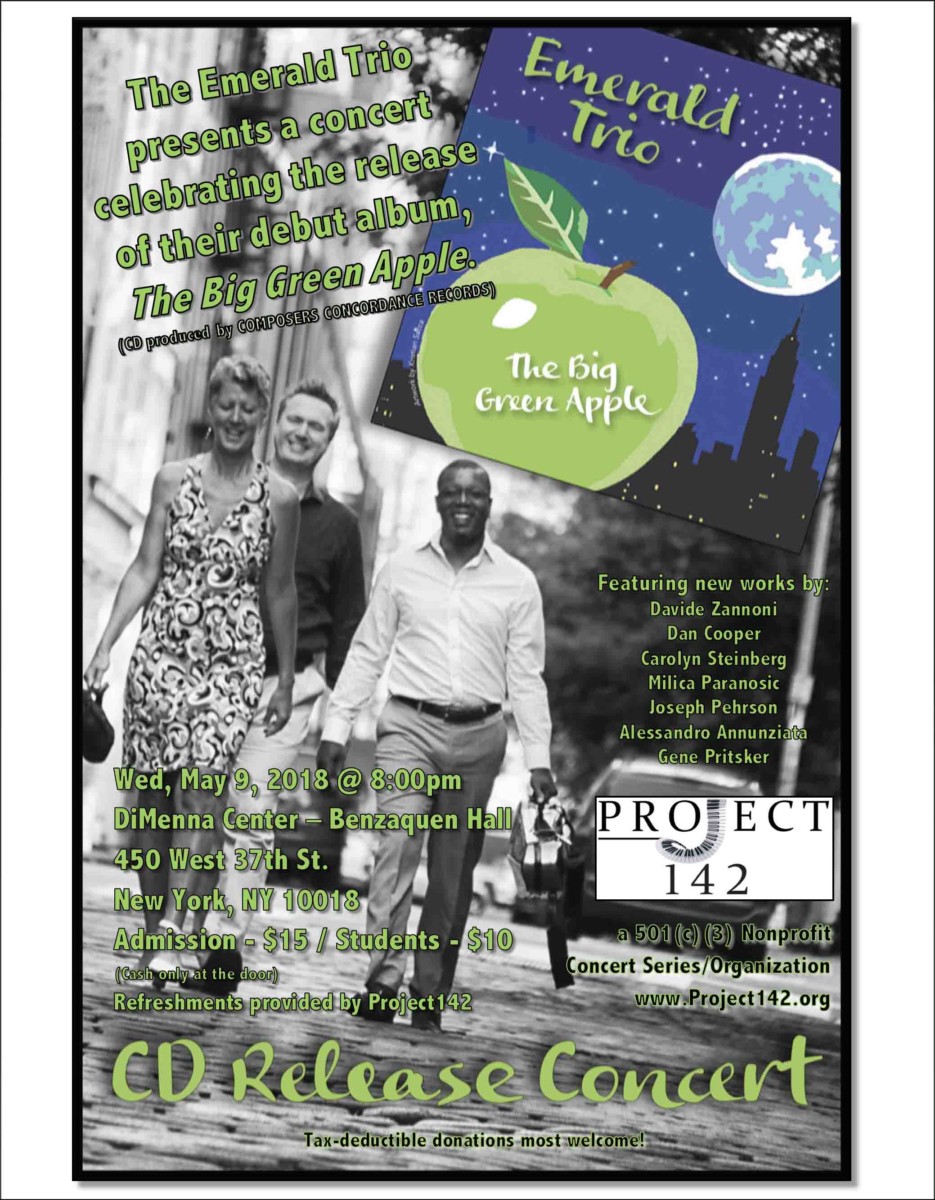Emerald Trio returns to Project 142 after a HIGHLY SUCCESSFUL Debut CD Release Concert Jan. 4, 2018 despite reeling from nor’easter storm Grayson that day. A very strong turnout on Jan. 4th!! May 9, 2018 Concert Date has been arranged for those followers of the Emerald Trio who were not able to join us on Jan. 4th (& for those who would like to join us again!!). Emerald Trio Debut CD is a compilation of works / music from 7 contemporary composers (Matt Castle – Dan Cooper – Gene Pritsker – Carolyn Steinberg – Joseph Pehrson – Milina Paranosic – Davide Zannoni). Copies of this NEW CD will be available for purchase!