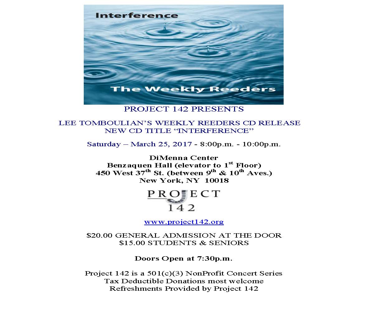 Saturday – March 25, 2017 – 8:00p.m. – 10:00p.m. – DiMenna Center – NYC – LEE TOMBOULIAN’S WEEKLY REEDERS NEW CD RELEASE “INTERFERENCE” – 450 West 37th St. (between 9th & 10th Aves. – on 10th Ave. end) – Benzaquen Hall (elevator to 1st Floor) – 10018. Doors open at 7:30p.m.