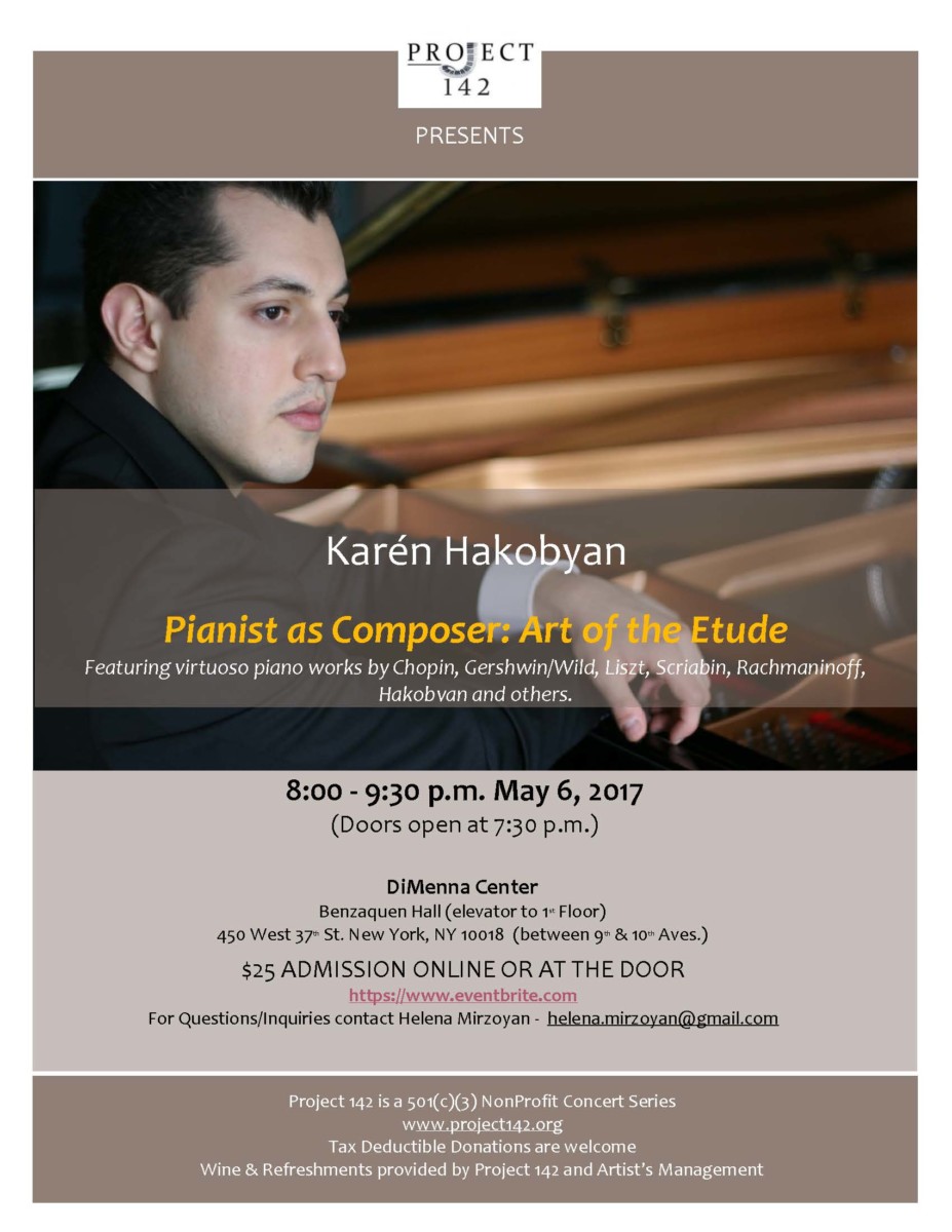 Saturday – May 6, 2017 – 8:00p.m. – 10:00p.m. – DiMenna Center – NYC – KAREN HAKOBYAN SOLO CLASSICAL PIANO CONCERT – 450 West 37th St. (between 9th & 10th Aves. 0n 10th Ave. end) – Benzaquen Hall (elevator to 1st Floor) – 10018. Doors open at 7:30p.m.