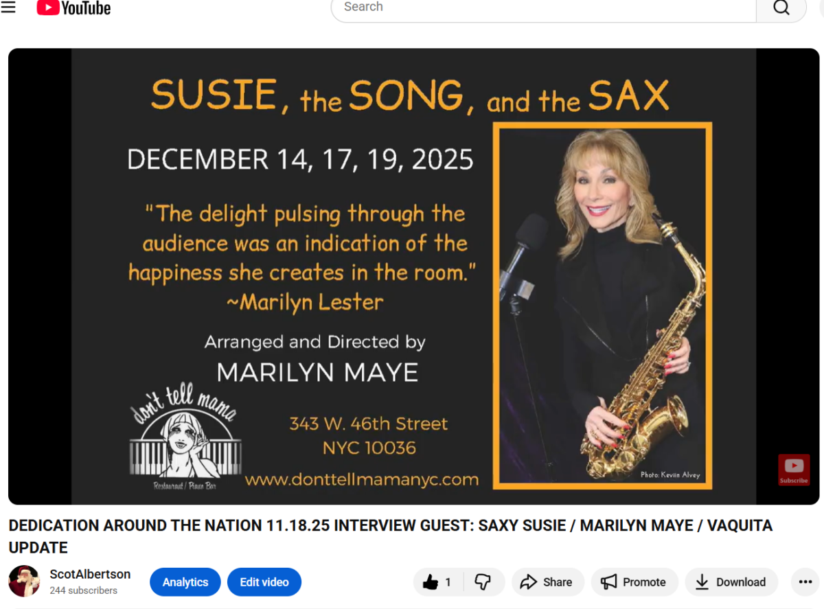 **SAXY SUSIE GUEST INTERVIEW www.saxysusie.com Episode for SUSIE’s NYC SHOWS at Don’t Tell Mama – DEC. 14 & 17 & 19, 2025