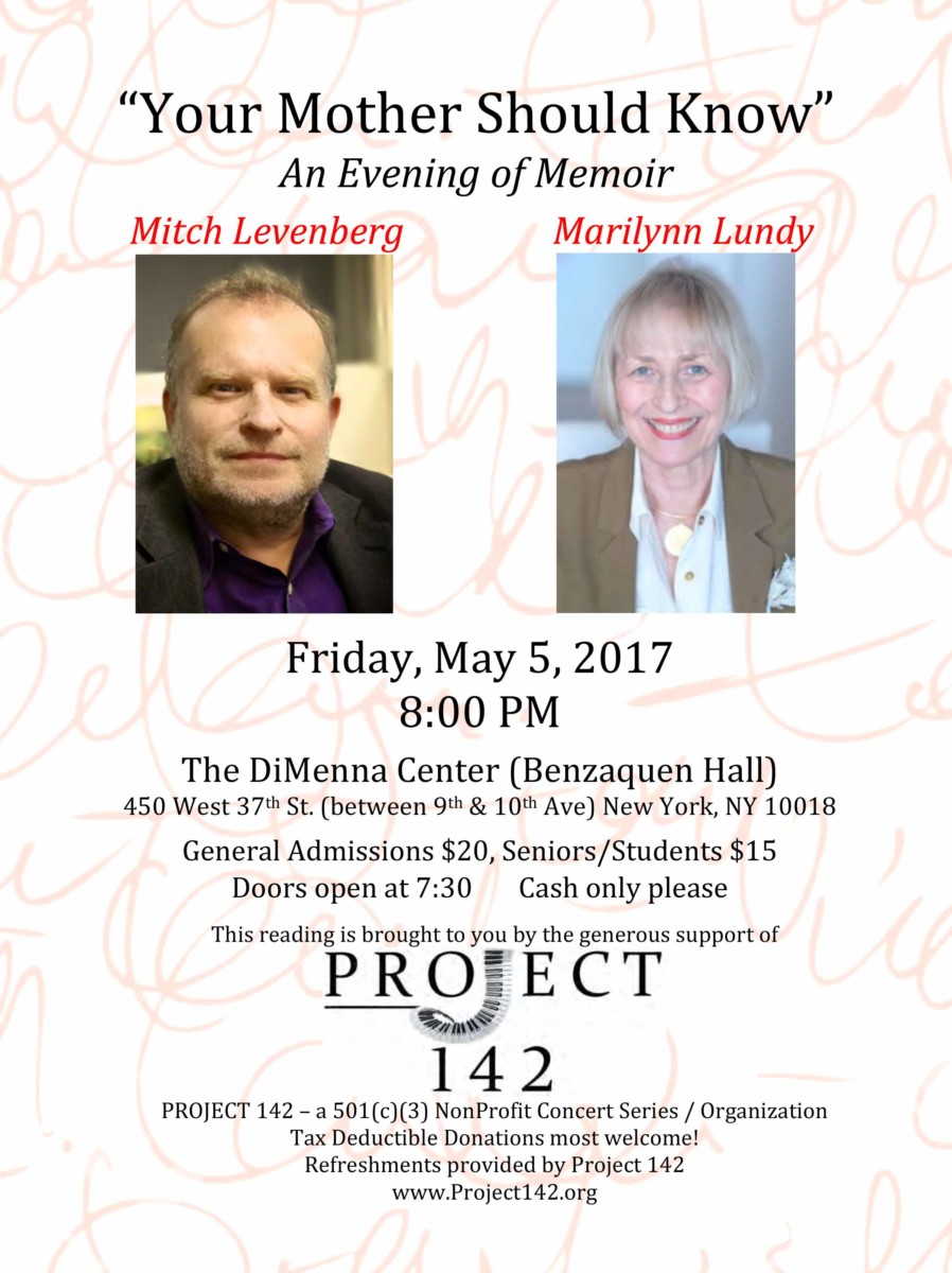 In a Reading about mothers, Mitch Levenberg reads from his memoir “Dementia Diaries” & Marilynn Lundy reads from her memoir “Who The Hell Do You Think You Are”.